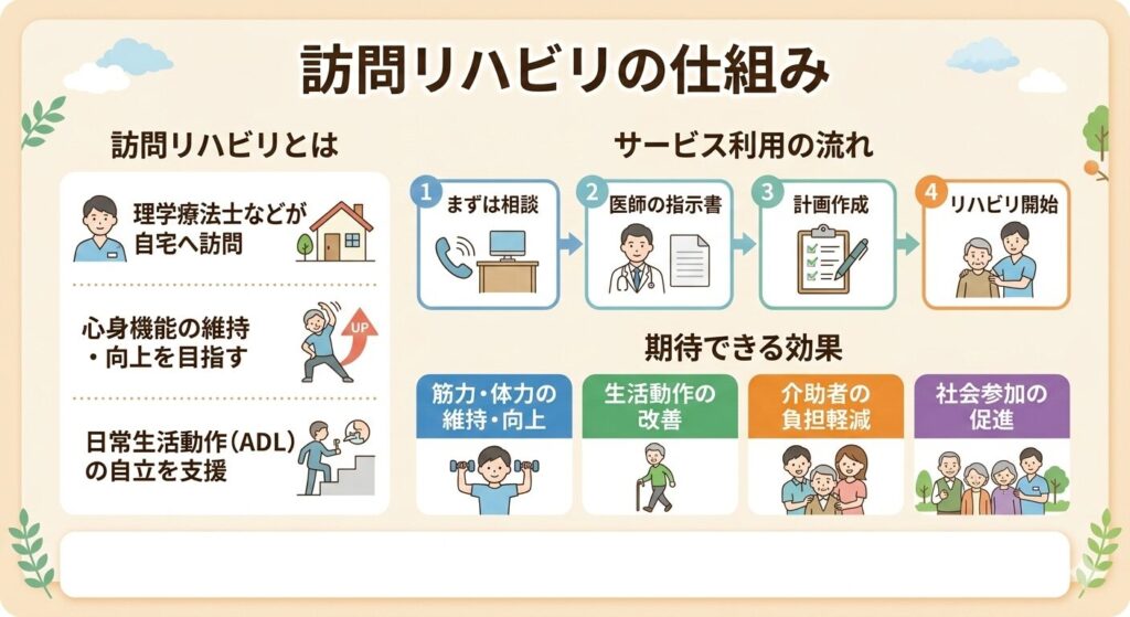 最大の目的は、単なる機能回復にとどまらず、住み慣れた自宅で安全に生活し続けることにあります。医師の指示のもと、専門職が生活環境を直接評価し、動作練習や福祉用具の選定、家族への介助指導を行うのが特徴です。
